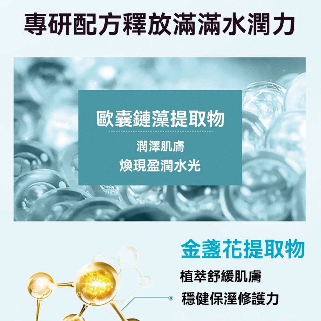 蘊含豐富的歐囊鏈藻、裙帶菜、毛蕊花、九肽、肌肽等萃取精華,保濕柔嫩、清新舒潤,令肌膚光澤細膩。