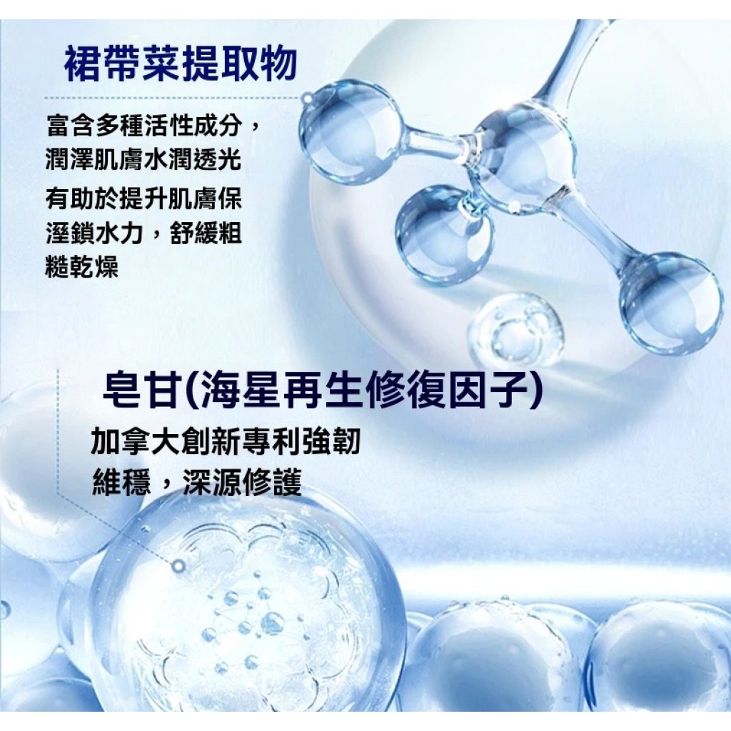 亮點成分:歐囊鏈藻提取物、皂苷、裙帶菜提取物、超氧化物歧化酶(SOD)、肌肽、九肽-1、毛蕊花提取物