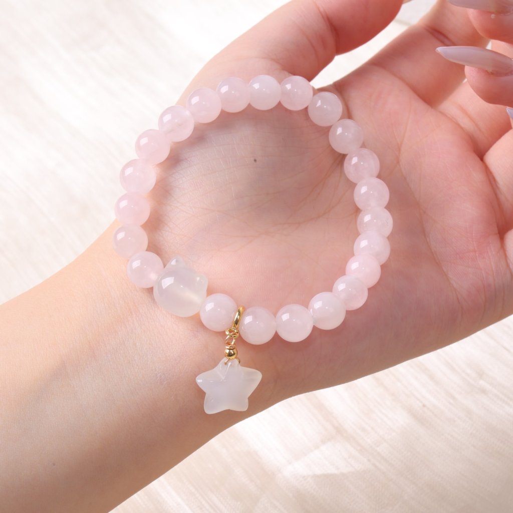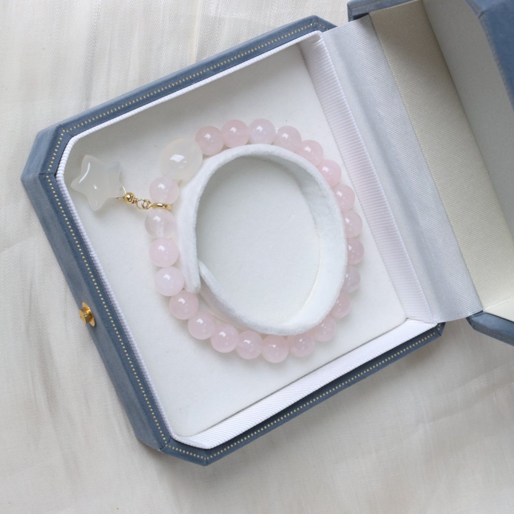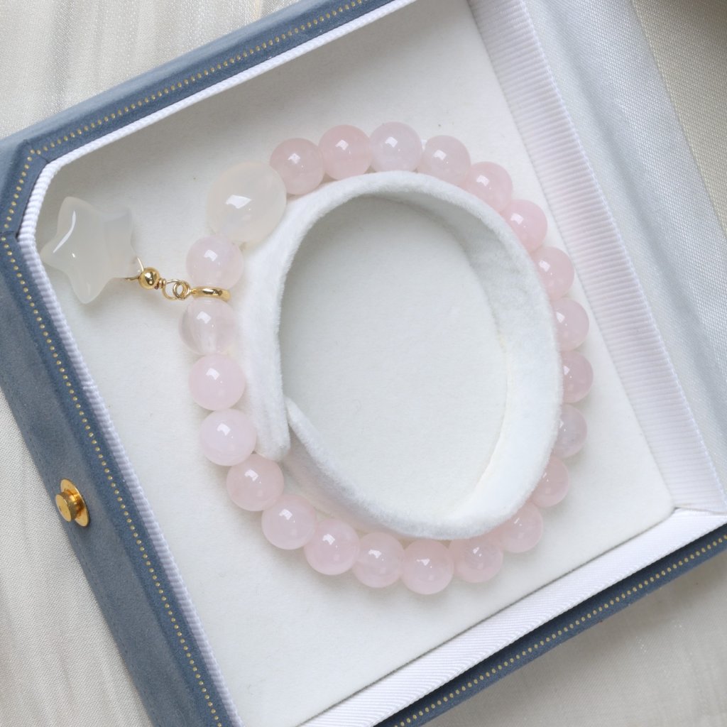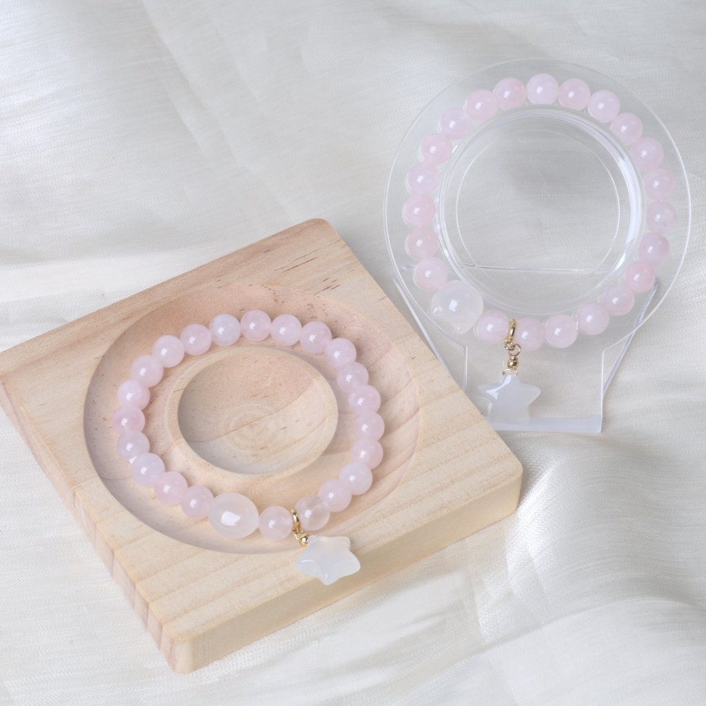 更特別的是 “星願” 概念:戴上它時,仿佛把自己的小小心願(不管是愛情、友情還是事業人緣)“寄託” 在珠子裏,每次抬手看到手腕上的柔粉光澤,都能想起對生活的美好期待,儀式感直接拉滿。日常搭配通勤裝,能中和正裝的嚴肅感;搭配休閒裝,又能增添幾分溫柔氣質,讓你在任何場合都自帶 “閃光點”。