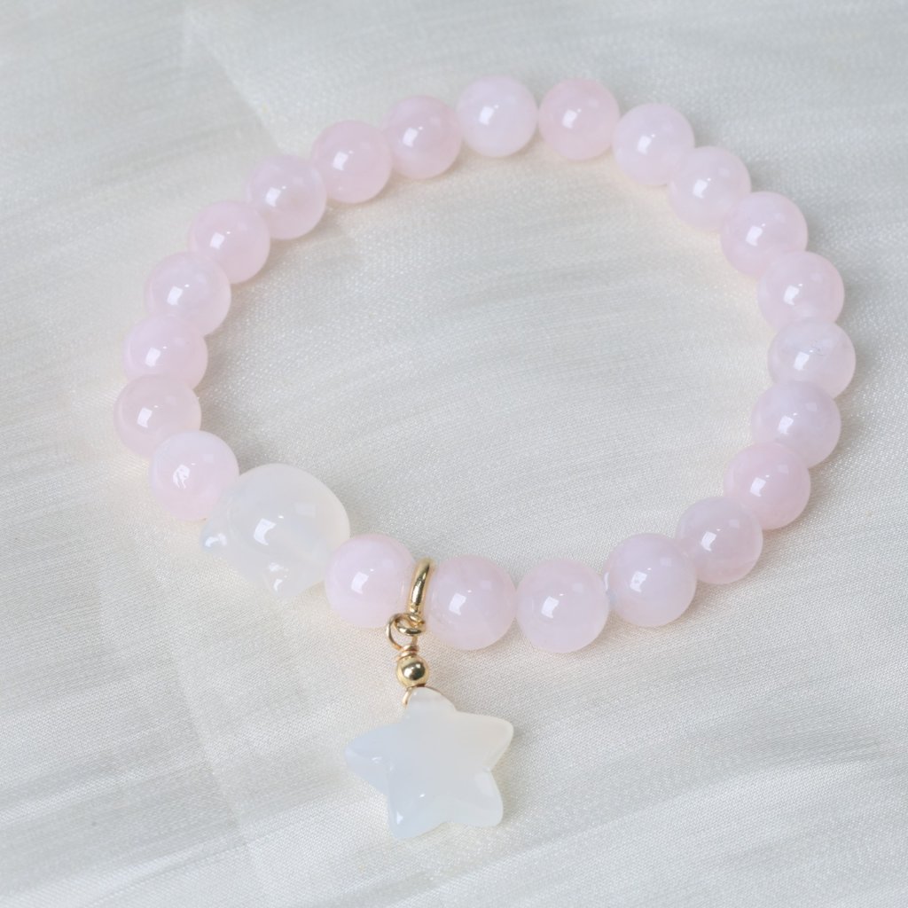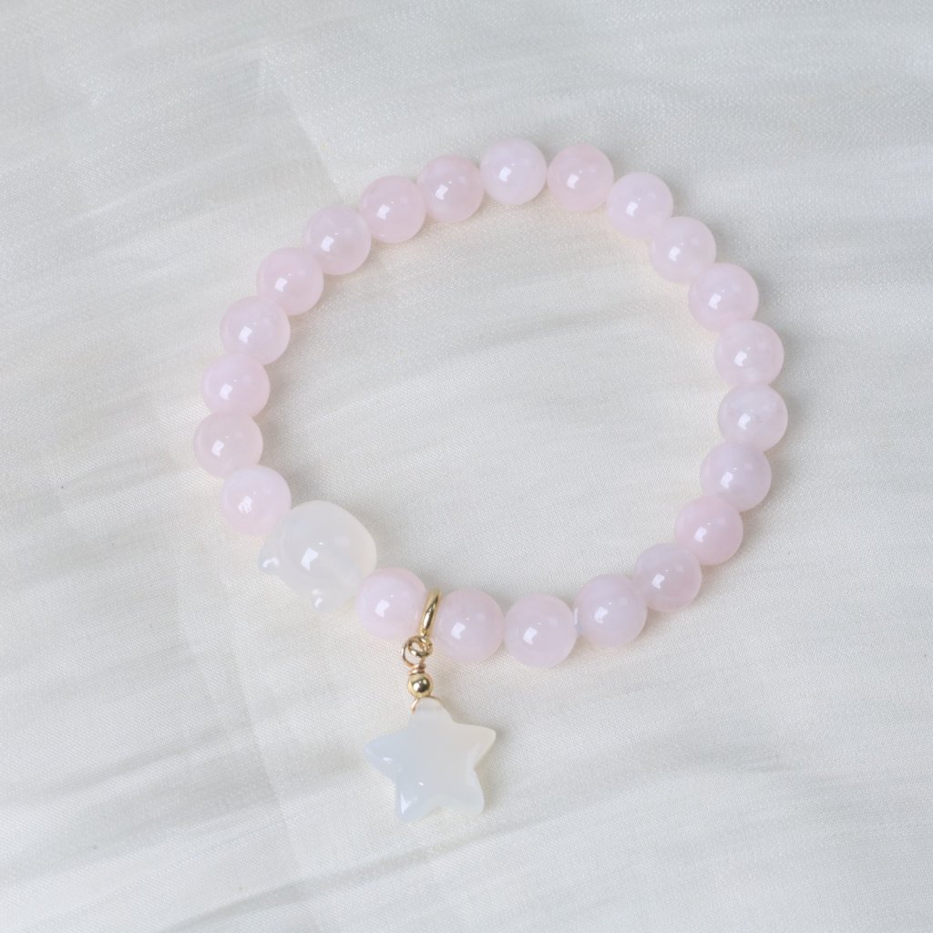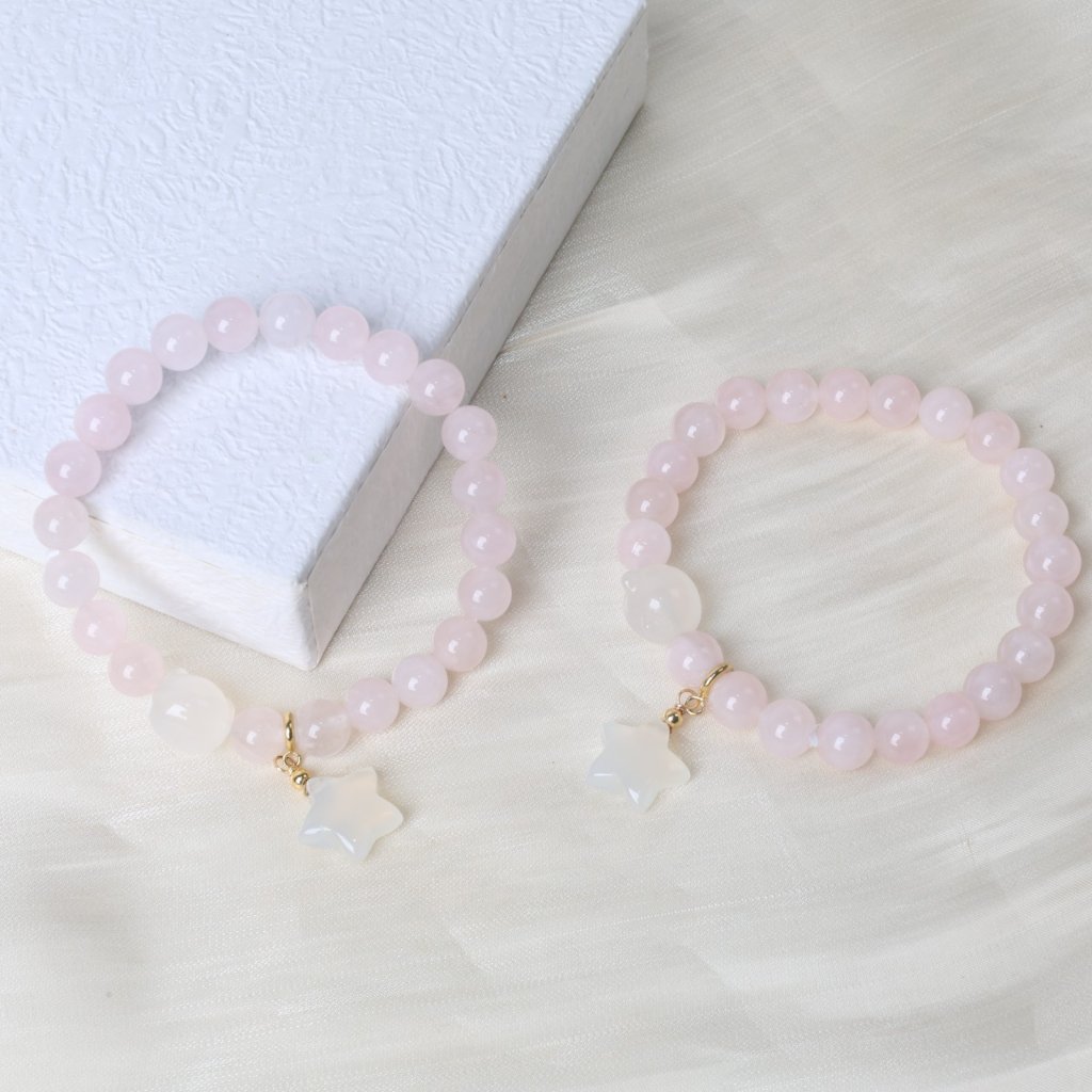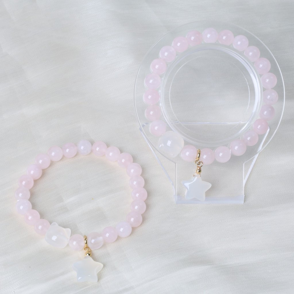 更特別的是 “星願” 概念:戴上它時,仿佛把自己的小小心願(不管是愛情、友情還是事業人緣)“寄託” 在珠子裏,每次抬手看到手腕上的柔粉光澤,都能想起對生活的美好期待,儀式感直接拉滿。日常搭配通勤裝,能中和正裝的嚴肅感;搭配休閒裝,又能增添幾分溫柔氣質,讓你在任何場合都自帶 “閃光點”。